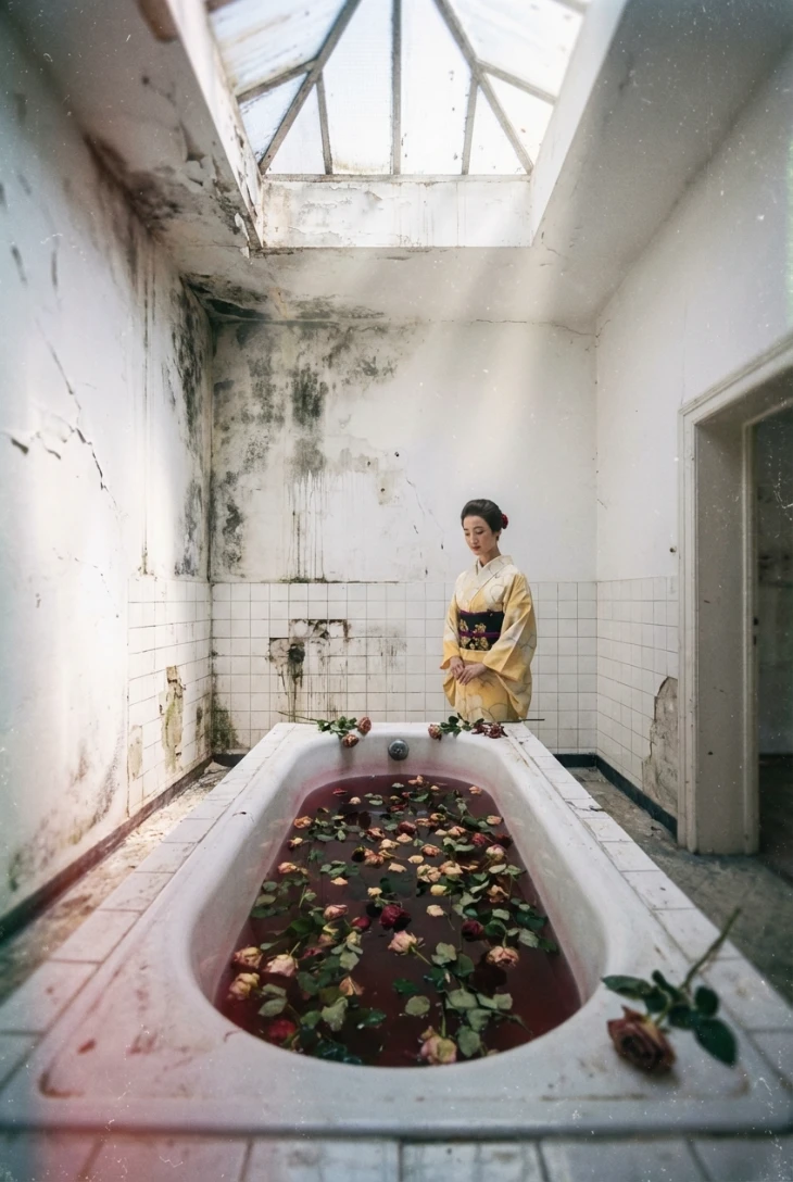 large white room / red-tinted water / wilted flowers / peeling tiles / dusty skylight light / expired film texture / subtle mold / soft blur