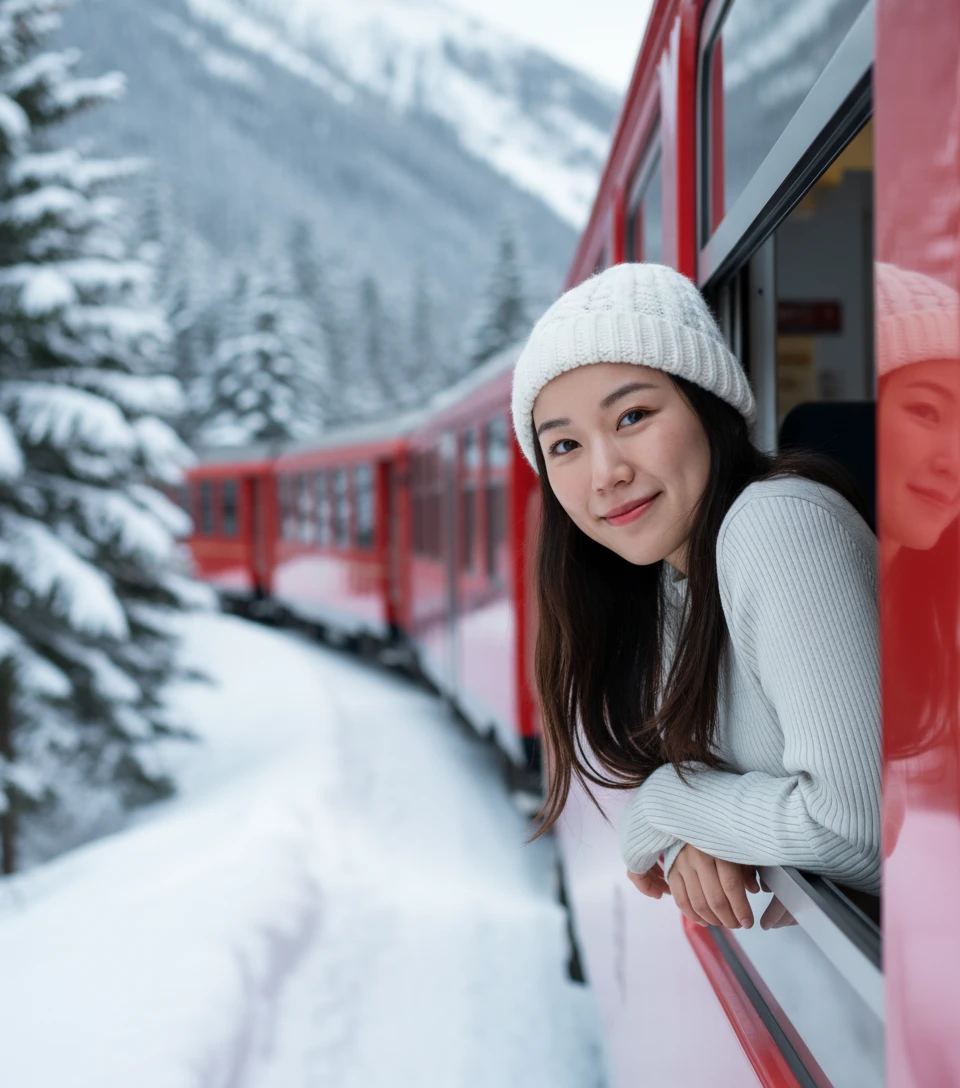 winter atmosphere / train travel / soft natural light / cinematic portrait
